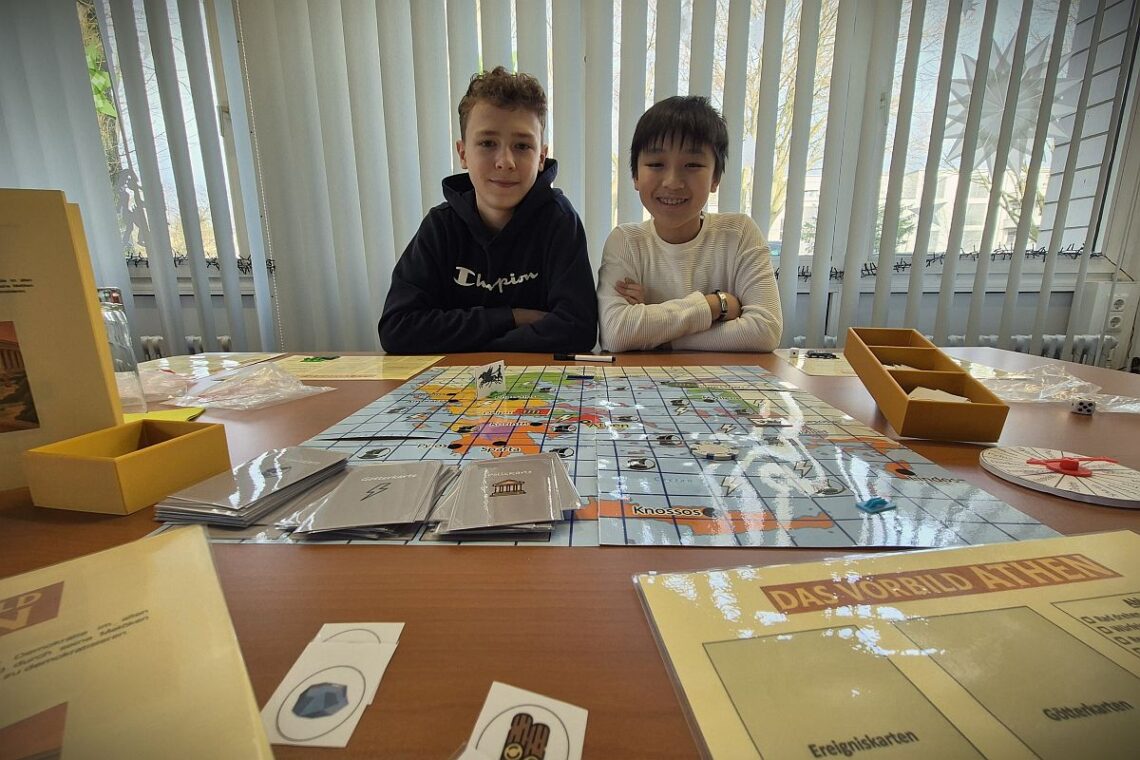 Luke und Nico erhalten 1. Preis beim Landeswettbewerb „Die Welt der Griechen“ Die Demokratie im antiken Griechenland zu verbreiten ist das Ziel des Brettspiels, das Luke und Nico sich im Rahmen der AG Geschichte überlegt und gestaltet haben. Spielerisch trägt man selbst dazu bei, die Demokratie gegen Angriffe zu schützen und zu verbreiten. Es ist ein Thema, das gerade in unruhigen Zeiten äußerst aktuell bleibt. Sicherlich haben die beiden aus diesem Grund beim landesweiten Wettbewerb den ersten Preis bekommen, aber auch das Design überzeugt: Das Spielmaterial ist so ansprechend gestaltet, dass man es sofort vermarkten könnte; es gibt sogar eine selbst verfasste schriftliche Spielanleitung. Für Luke und Nico folgte nun…