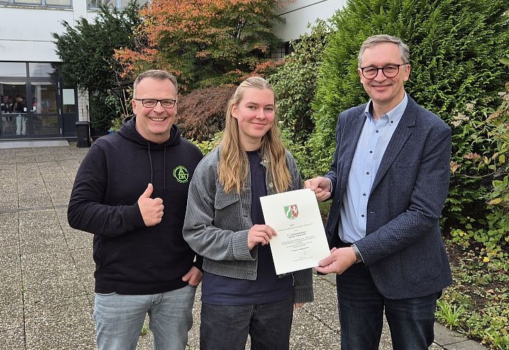 Lynn wurde mit ihrem Essay mit einer Urkunde der Bezirksregierung ausgezeichnet, die vom Jahrgangsstufenbetreuer Herrn Dr. Krenzer und unserem Schulleiter Markus Klein voller Stolz überreicht wurde.