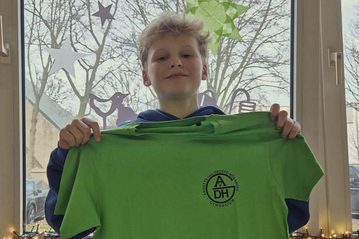 Ankündigungen Nils bedankt sich für ein T-Shirt 18. Dezember 2025 / Neben drei Hoodies stiftete der Förderverein unserer Schule auch vier T-Shirts. einer der Gewinner ist Nils, der sich dafür bedankt. Wir sagen allen Gewinnerinnen und Gewinnern unserer Shirts herzlichen Glückwunsch.